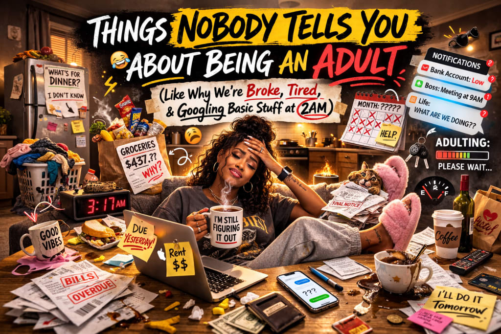 What actually happens is you wake up one day, you’re thirty-something years old, standing in your kitchen eating shredded cheese out of the bag like a raccoon, wondering how the hell you became responsible for bills, decisions, and your own doctor’s appointments.