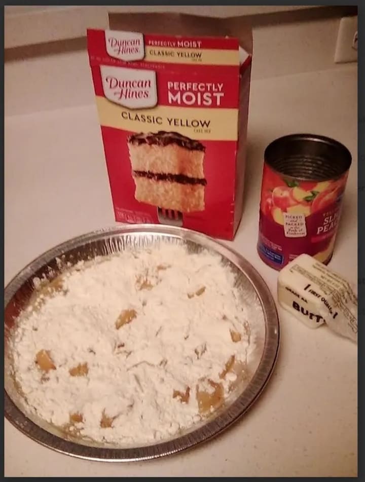 The three prime ingredients are: Cake mix, butter, and can peaches.