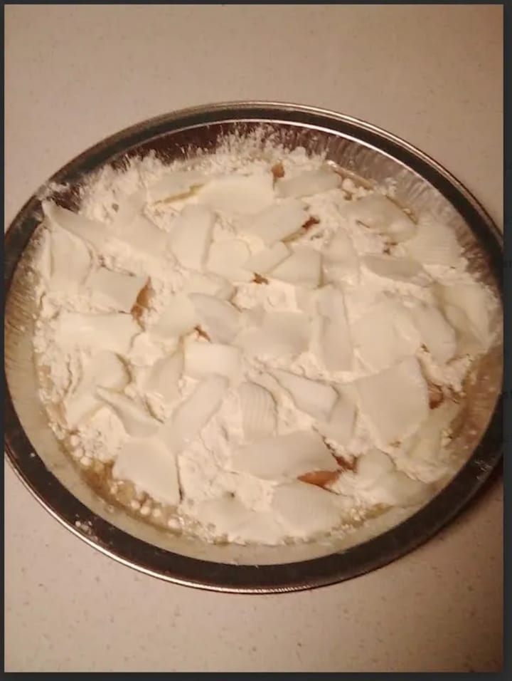 Roughly 1/4 bag of cake mix (sprinkled generously on the surface of the peaches)