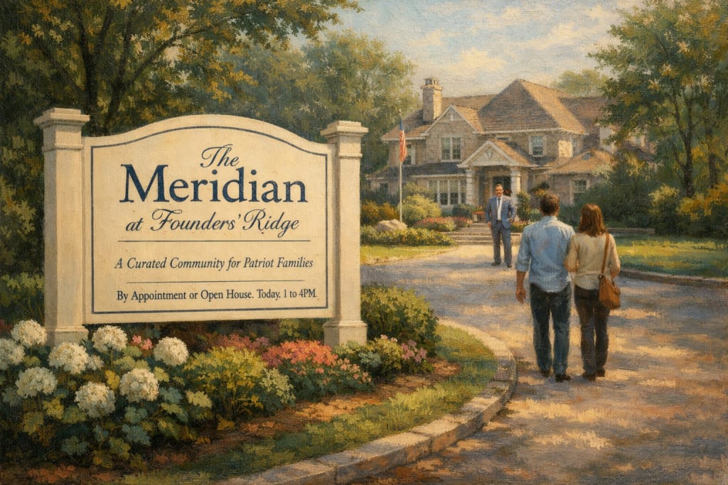 The sign at the entrance was tasteful, navy lettering on cream stock, the font the sort that suggested old money had always been there, like a geological feature. The Meridian at Founders' Ridge: A Curated Community for Patriot Families. Below it, in smaller text: By Appointment or Open House. Today: 1 to 4 PM.