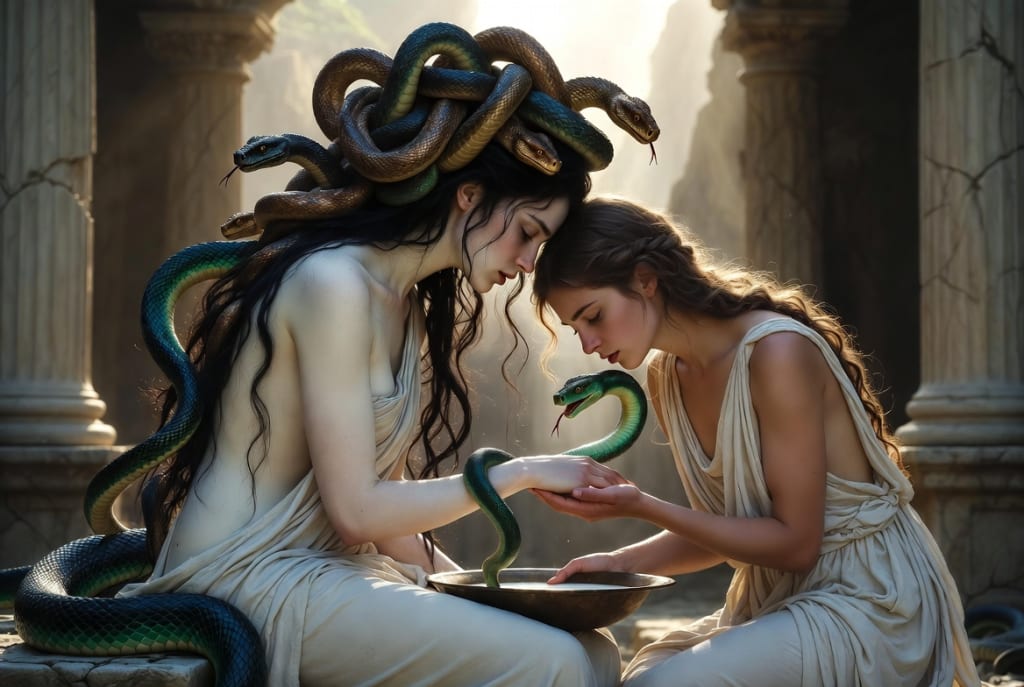 Medusa exhaled, a sound so fragile it might have been a sob held back for centuries. “Then witness this: I was not always this. I was a girl who laughed. I was a priestess who believed the goddess heard me. I was loved, once, and I loved in return. The serpents remember that girl. They mourn her every day.”