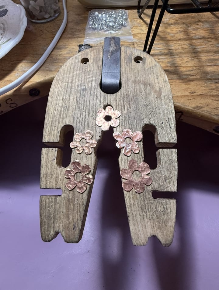 5:44 pm I have felt quite weak today, but I pushed myself through. Filed the rough edges off these copper flowers, then I have just finished sawing out the centre holes for the bolts. I am feeling accomplished!