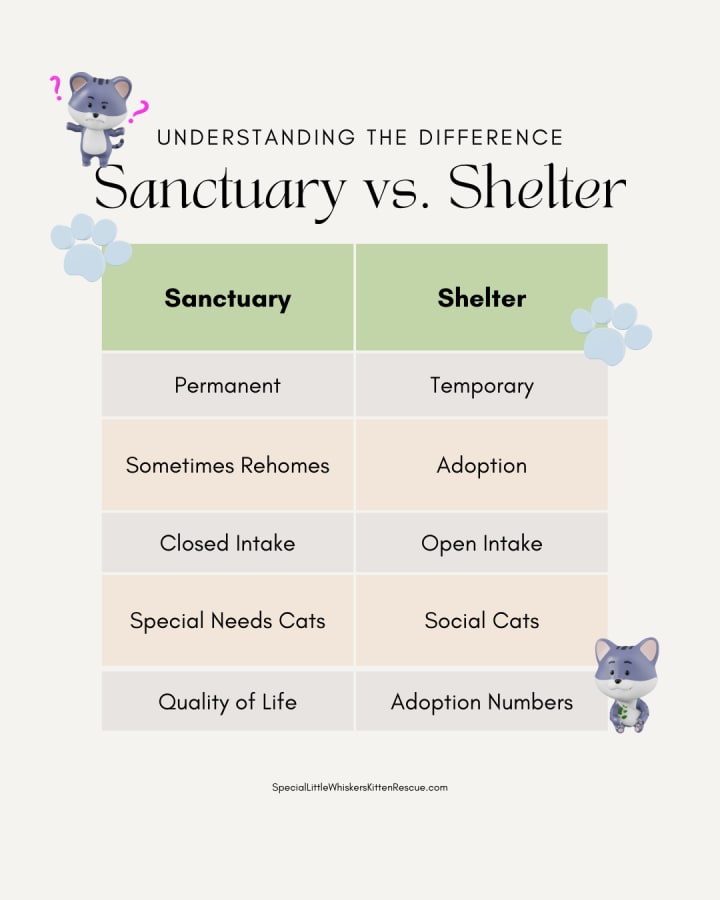 While a shelter may assist thousands of cats annually, a cat sanctuary houses dozens of cats for decades.