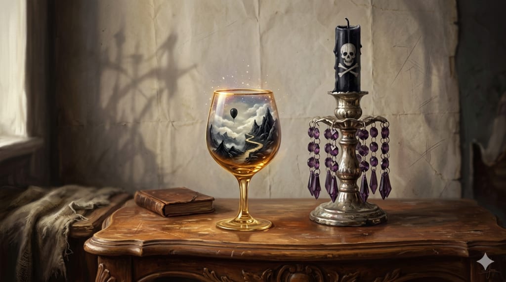 A vessel with a little amber left, a decorated thing